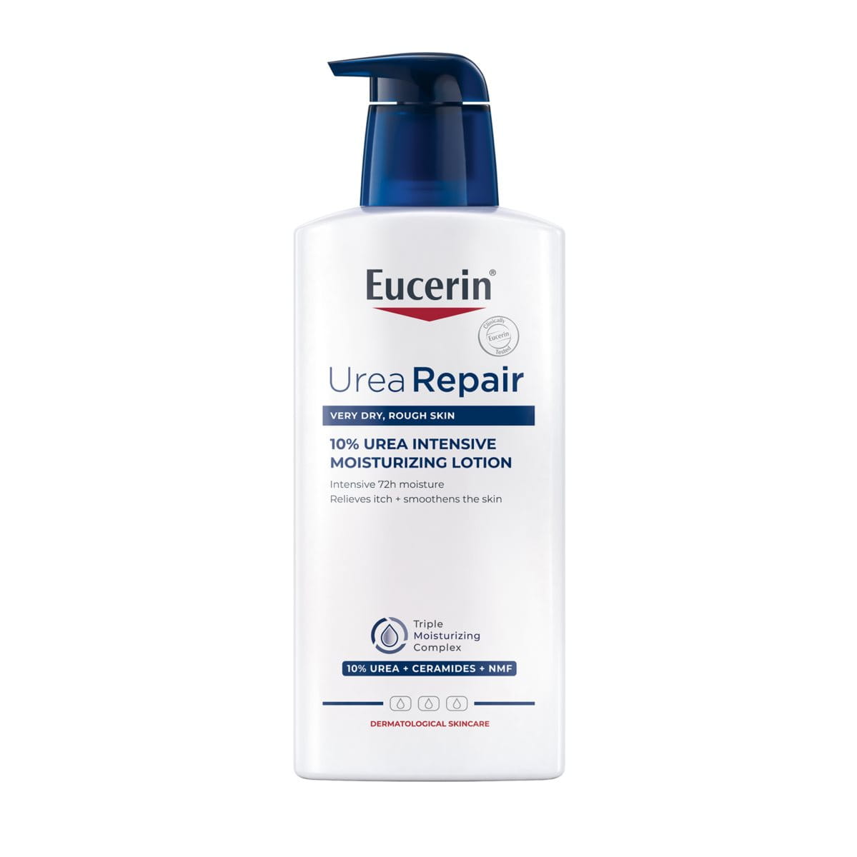 Eucerin UreaRepair PLUS 10% Urea Lotion är speciellt utvecklad för intensiv vård av torr hud och är lämplig för att behandla keratosis pilaris. Formulan är kliniskt och dermatologiskt beprövad för att ge omedelbar lindring och en intensiv, långvarig återfuktning, som fördröjer torrhet och grov textur i upp till 48 timmar.