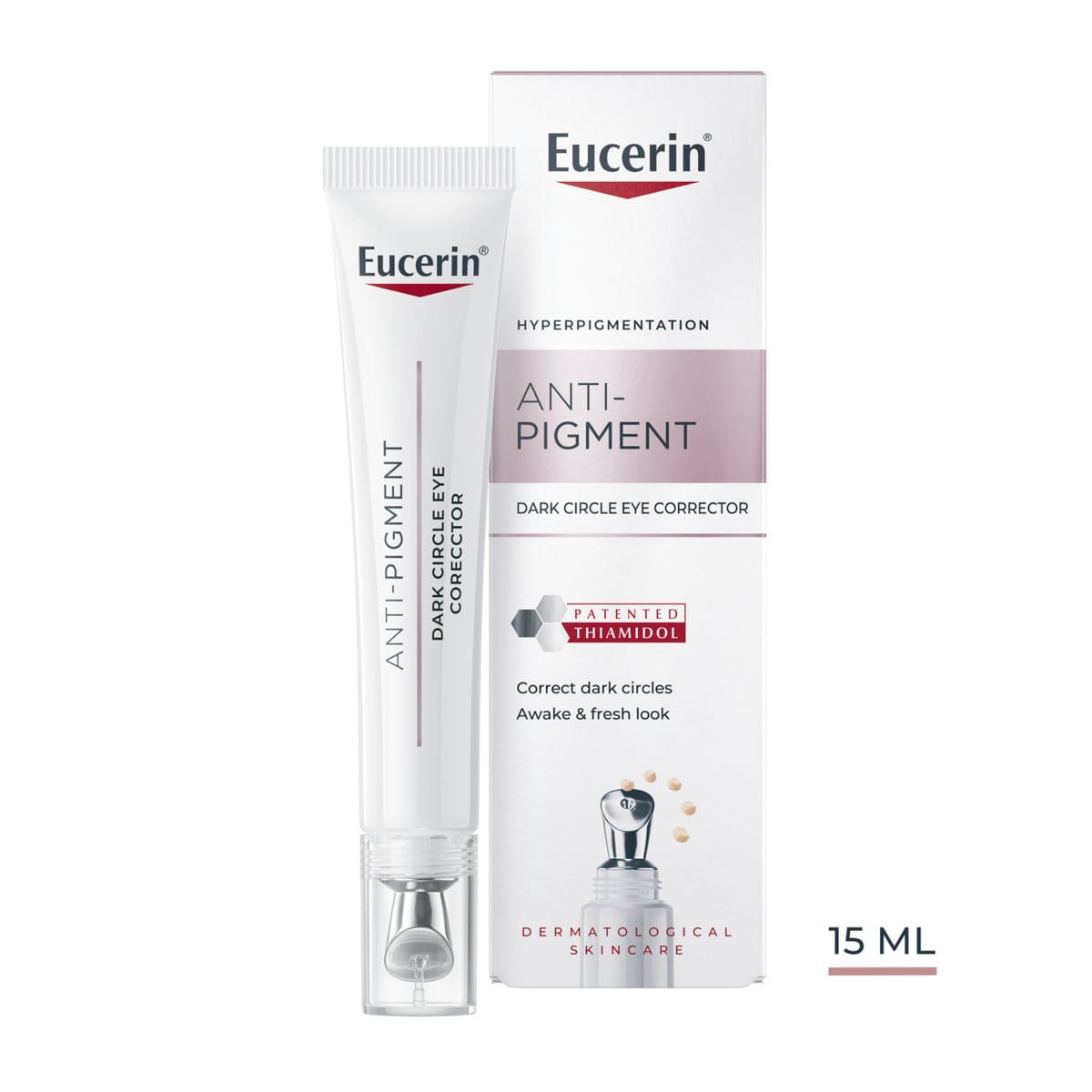 Eucerin ANTI-PIGMENT Dark Circle Eye Corrector är en ögoncreme som effektivt reducerar mörka ringar under ögonen, tack vare den patenterade ingrediensen Thiamidol®. Formulan innehåller ljusreflekterande pigment som omedelbart ger ett fräschare och piggare utseende. Hyaluronsyran bidrar till att reducera svullnad och att fylla ut fina linjer och rynkor. Den kylande metallapplikatorn ger en behaglig känsla.