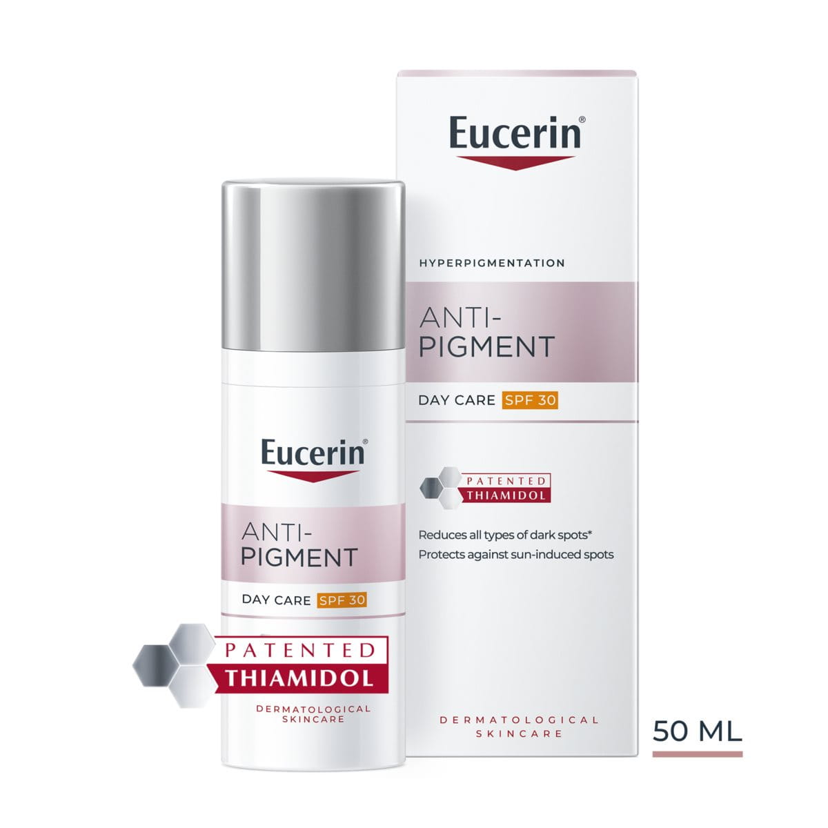 Återfukta huden med Eucerin Anti-Pigment Day SPF 30 på morgonen och Eucerin Anti-Pigment Night på kvällen. Använd Eucerin Anti-Pigment Dual Serum och/eller Eucerin Anti-Pigment Spot Corrector innan du använder fuktcremen för bästa resultat. Produkter som innehåller Thiamidol bör appliceras max fyra gånger per dag.