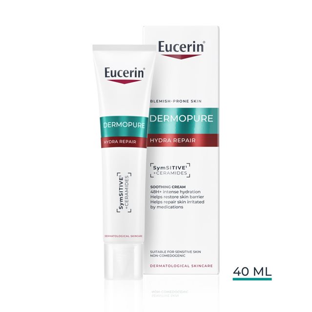 Eucerin Dermopure Hydra Repair reparerar hudbarriären och lugnar irritaion och rodnad.