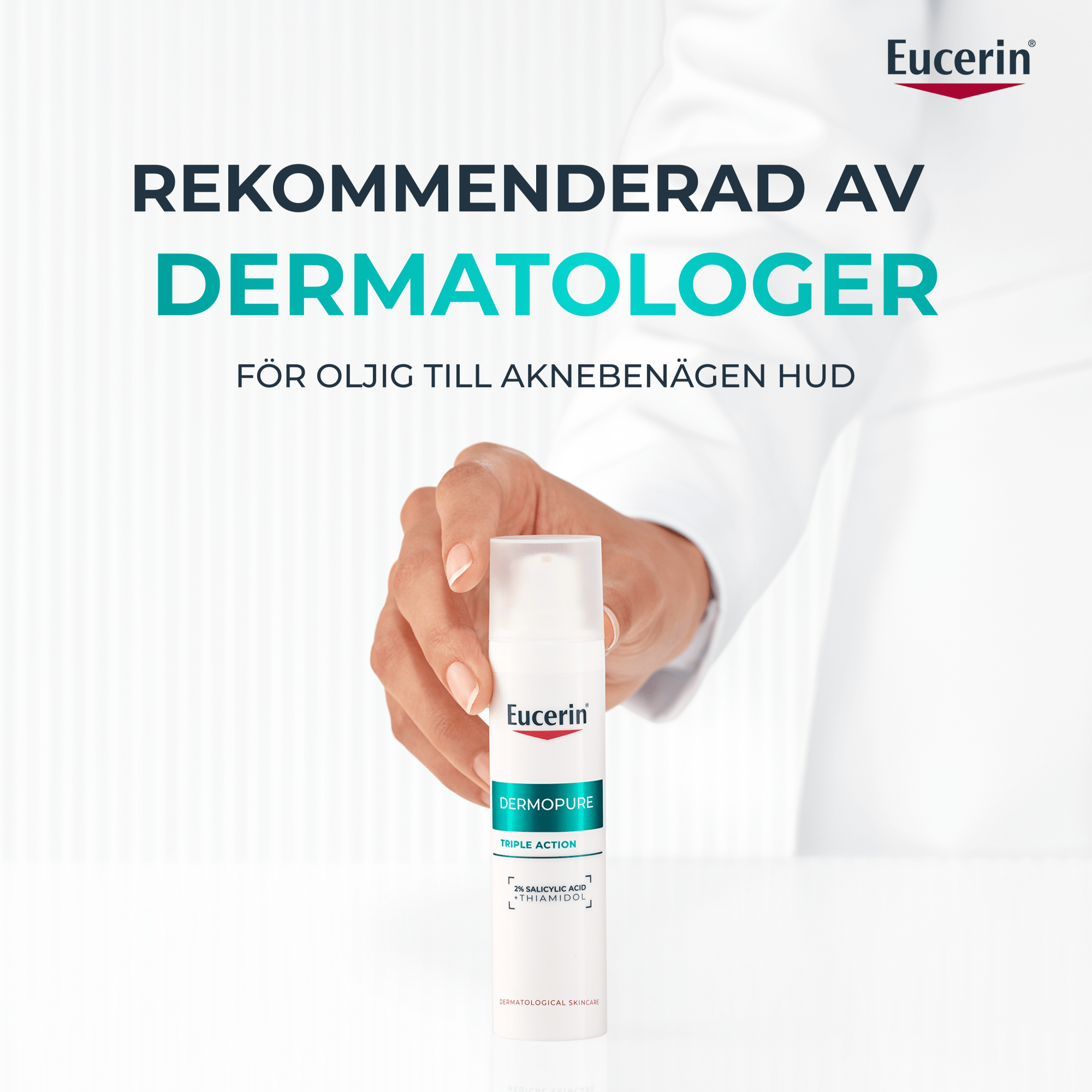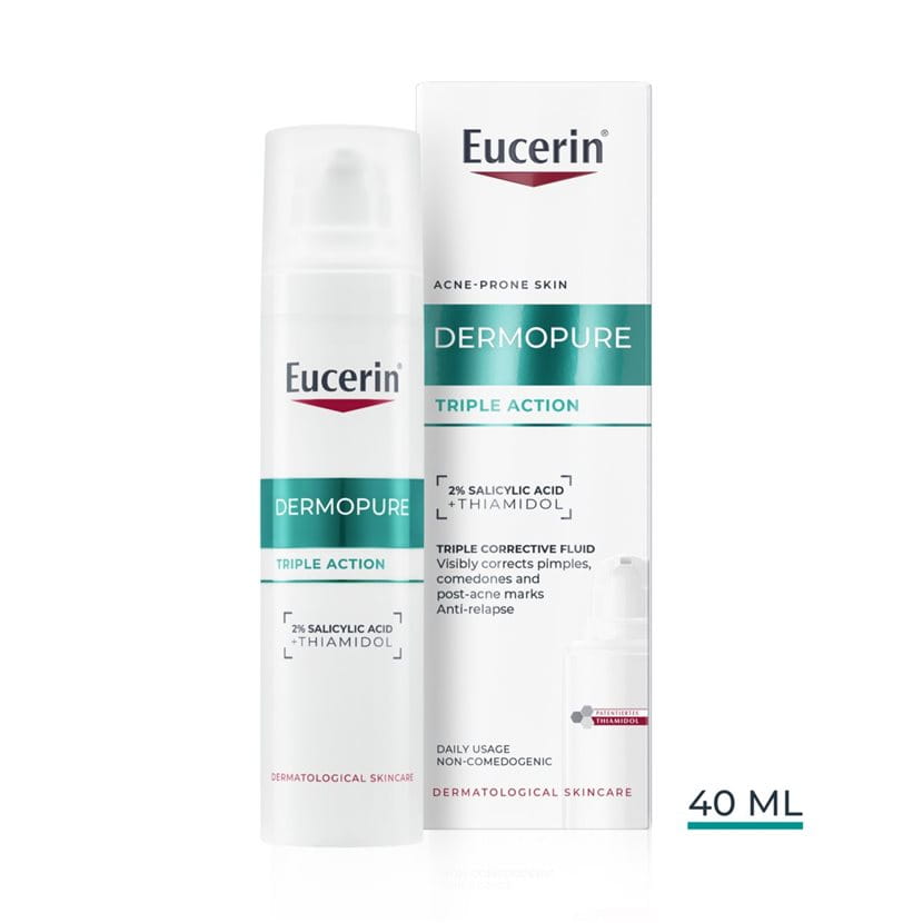 Thiamidol är en exklusiv och patenterad aktiv ingrediens som utvecklats under ett 10-årigt forskningsprojekt. Den minskar postinflammatorisk hyperpigmentering genom att ta itu med grundorsaken, produktionen av melanin i huden. Många kända ingredienser har genomgått tester på enbart svampenzymer snarare än på mänskliga hudegenzymer. Effekten av Thiamidol i vår Eucerin® Dermopure Triple Action har visats i tester i verkliga livet. Kliniska prövningar* och andra svar har visat att vår formulering effektivt minskar märken efter akne.