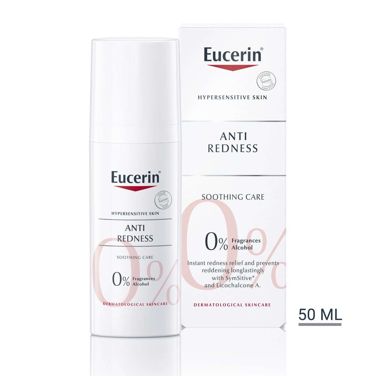 Eucerin ANTI REDNESS Soothing Care är en återfuktande ansiktscreme som minskar och lugnar rodnad, irritation och sveda omedelbart och förhindrar rodnad långsiktigt. Cremen lugnar kliande och irritation på huden, tack vare de aktiva ingredienserna. SymSitive* som är speciellt framtagen för hyperkänslig hud och lakritsrotextrakt som dämpar rodnad effektivt. Formulan hjälper även till att reducera stramhet dygnet runt och förbättrar hudens tillstånd.