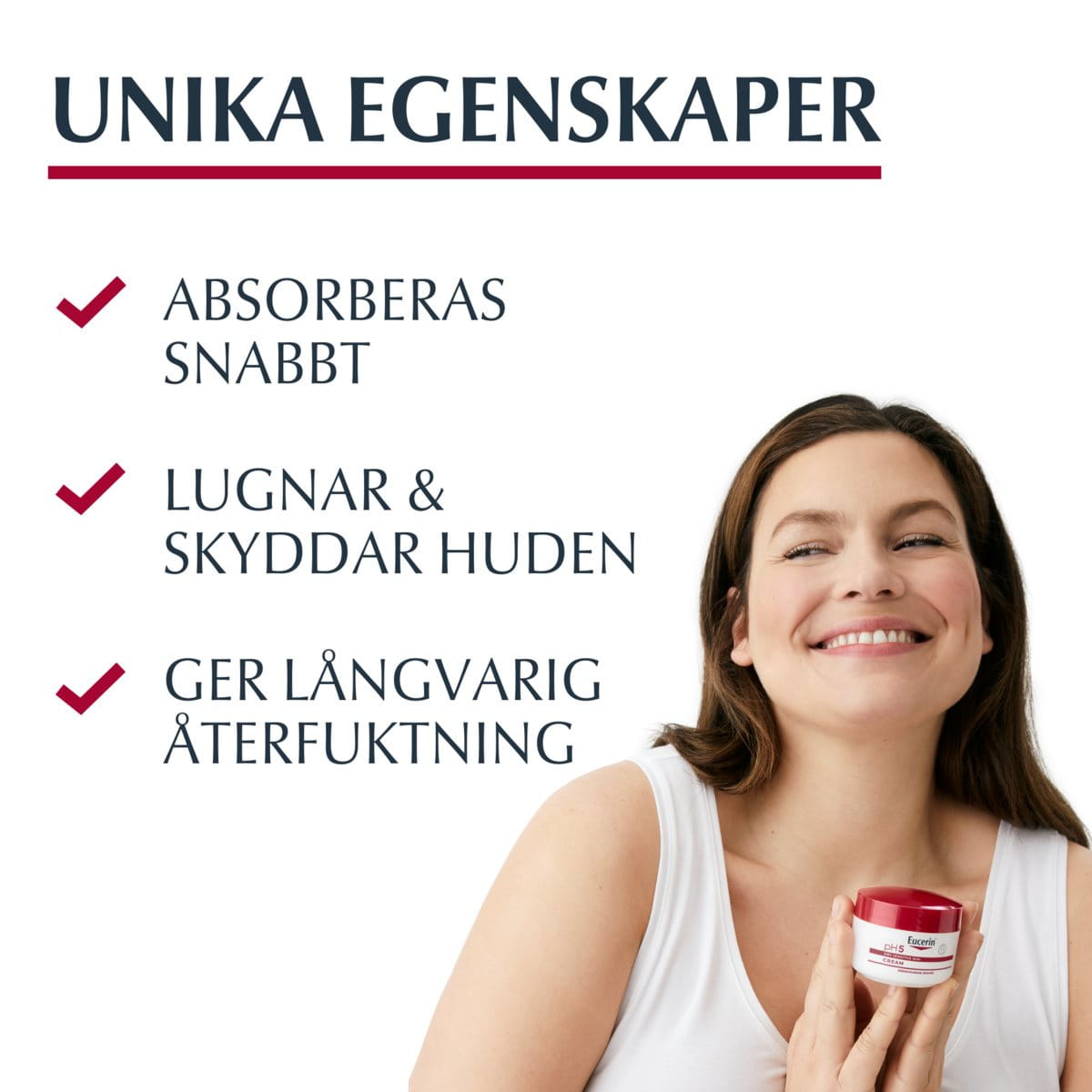 Eucerin pH5 Cream har särskilt utvecklats för torr och känslig hud i ansiktet och på kroppen. Det unika Eucerin pH Balance System innehåller en pH5 citratbuffert som återställer och stödjer hudens optimala pH-värde. Sammansättningen innehåller även dexpantenol, en aktiv ingrediens som är känd för sina återhämtande egenskaper.