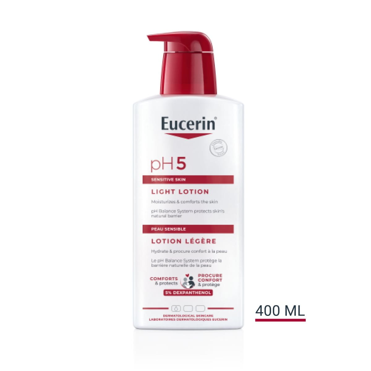 Eucerin pH5 Lotion är en mild men effektiv fuktlotion till kroppen. Den har en särskild sammansättning som gör normal till torr hud på kroppen mer motståndskraftig och mindre känslig. Det unika Eucerin pH Balance System innehåller en pH5 citratbuffert som återställer och stödjer hudens optimala pH-värde. Kroppslotionen innehåller även dexpantenol, som är en aktiv ingrediens som är känd för sina återhämtande egenskaper.